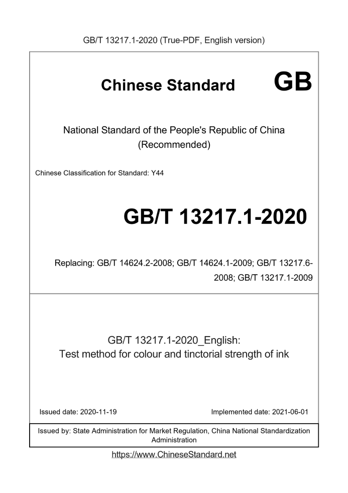 Delivery: <= 3 days. True-PDF full-copy in English will be manually translated and delivered via email. GB/T 13217.1-2020: Test method for colour and tinctorial strength of ink Status: Valid GB/T 13217.1: Historical versions