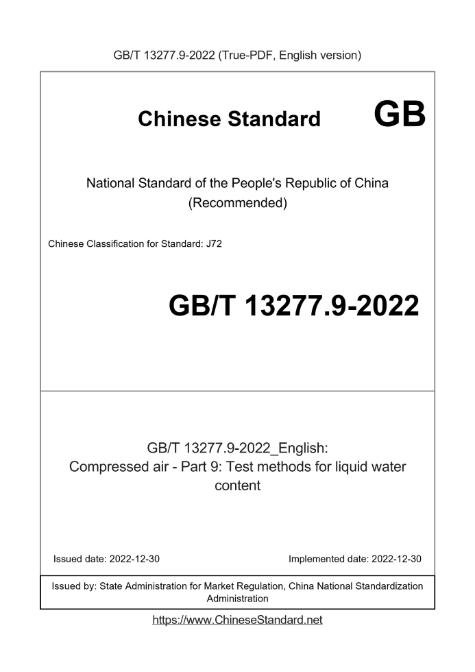 Delivery: <= 3 days. True-PDF full-copy in English will be manually translated and delivered via email. GB/T 13277.9-2022: Compressed air - Part 9: Test methods for liquid water content Status: Valid