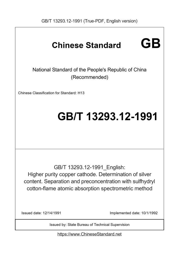 GB/T 13293.12-1991199 Add to Cart 2 days Higher purity copper cathode. Determination of silver content. Separation and preconcentration with sulfhydryl cotton-flame atomic absorption spectrometric method Obsolete