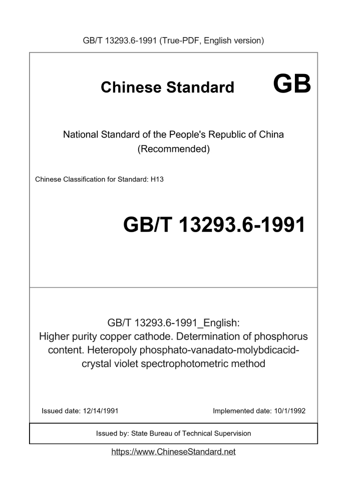 Delivery: <= 2 days. True-PDF full-copy in English will be manually translated and delivered via email. GB/T 13293.6-1991: Higher purity copper cathode. Determination of phosphorus content. Heteropoly phosphato-vanadato-molybdicacid-crystal violet spectrophotometric method Status: Obsolete