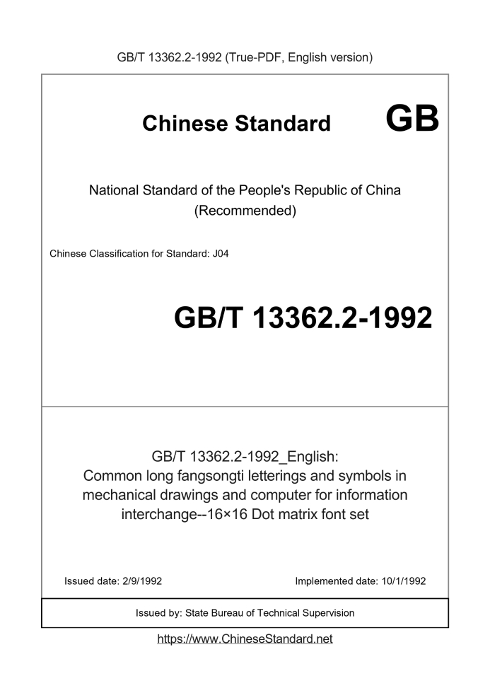 Delivery: <= 3 days. True-PDF full-copy in English will be manually translated and delivered via email. GB/T 13362.2-1992: Common long fangsongti letterings and symbols in mechanical drawings and computer for information interchange--16×16 Dot matrix font set Status: Obsolete