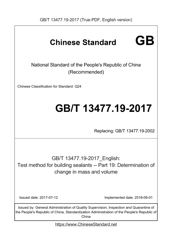 Delivery: <= 3 days. True-PDF full-copy in English will be manually translated and delivered via email. GB/T 13477.19-2017: Test method for building sealants -- Part 19: Determination of change in mass and volume Status: Valid GB/T 13477.19: Historical versions