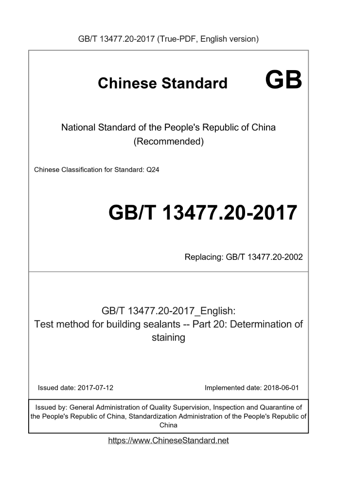 Delivery: <= 3 days. True-PDF full-copy in English will be manually translated and delivered via email. GB/T 13477.20-2017: Test method for building sealants -- Part 20: Determination of staining Status: Valid GB/T 13477.20: Historical versions