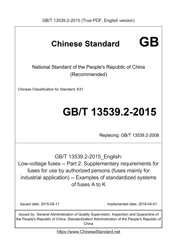 Delivery: <= 10 days. True-PDF full-copy in English will be manually translated and delivered via email. GB/T 13539.2-2015: Low-voltage fuses -- Part 2: Supplementary requirements for fuses for use by authorized persons (fuses mainly for industrial application) -- Examples of standardized systems of fuses A to K Status: Valid GB/T 13539.2: Historical versions