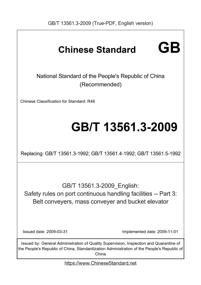 Delivery: <= 3 days. True-PDF full-copy in English will be manually translated and delivered via email. GB/T 13561.3-2009: Safety rules on port continuous handling facilities -- Part 3: Belt conveyers, mass conveyer and bucket elevator Status: Valid GB/T 13561.3: Historical versions