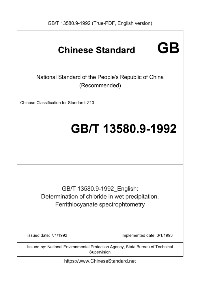 Delivery: <= 2 days. True-PDF full-copy in English will be manually translated and delivered via email. GB/T 13580.9-1992: Determination of chloride in wet precipitation. Ferrithiocyanate spectrophtometry