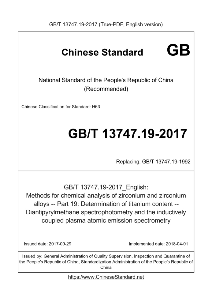 Delivery: <= 3 days. True-PDF full-copy in English will be manually translated and delivered via email. GB/T 13747.19-2017: Methods for chemical analysis of zirconium and zirconium alloys -- Part 19: Determination of titanium content -- Diantipyrylmethane spectrophotometry and the inductively coupled plasma atomic emission spectrometry Status: Valid GB/T 13747.19: Historical versions