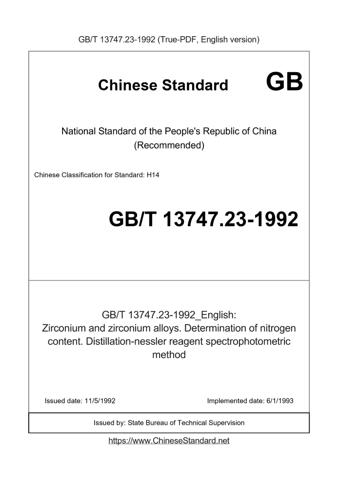 Delivery: <= 2 days. True-PDF full-copy in English will be manually translated and delivered via email. GB/T 13747.23-1992: Zirconium and zirconium alloys. Determination of nitrogen content. Distillation-nessler reagent spectrophotometric method