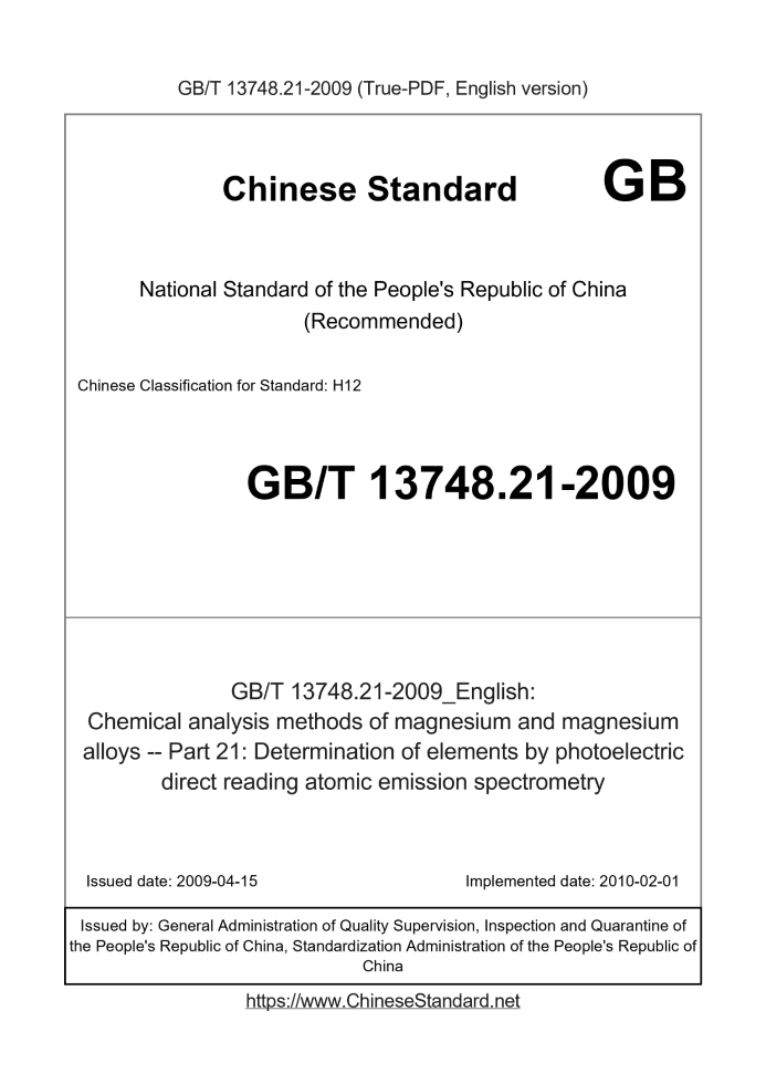 Delivery: <= 3 days. True-PDF full-copy in English will be manually translated and delivered via email. GB/T 13748.21-2009: Chemical analysis methods of magnesium and magnesium alloys -- Part 21: Determination of elements by photoelectric direct reading atomic emission spectrometry Status: Valid