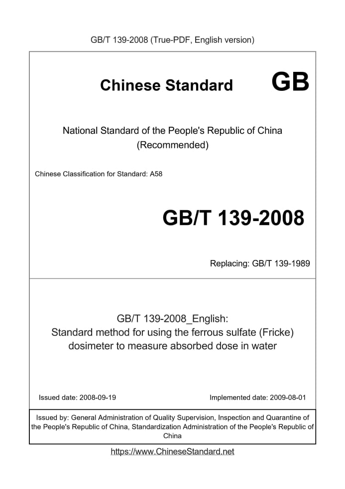 Delivery: <= 3 days. True-PDF full-copy in English will be manually translated and delivered via email. GB/T 139-2008: Standard method for using the ferrous sulfate (Fricke) dosimeter to measure absorbed dose in water Status: Valid GB/T 139: Historical versions