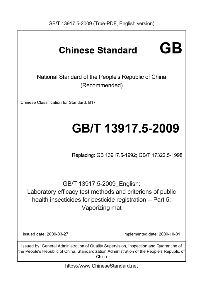 Delivery: <= 3 days. True-PDF full-copy in English will be manually translated and delivered via email. GB/T 13917.5-2009: Laboratory efficacy test methods and criterions of public health insecticides for pesticide registration -- Part 5: Vaporizing mat Status: Valid GB/T 13917.5: Historical versions