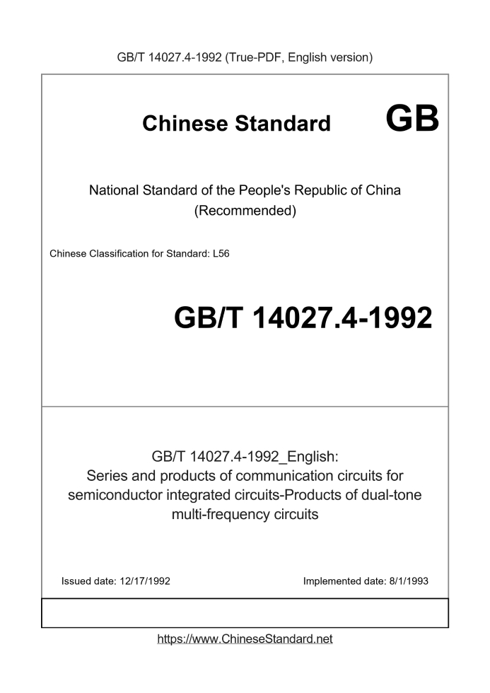 Delivery: <= 3 days. True-PDF full-copy in English will be manually translated and delivered via email. GB/T 14027.4-1992: Series and products of communication circuits for semiconductor integrated circuits-Products of dual-tone multi-frequency circuits Status: Obsolete