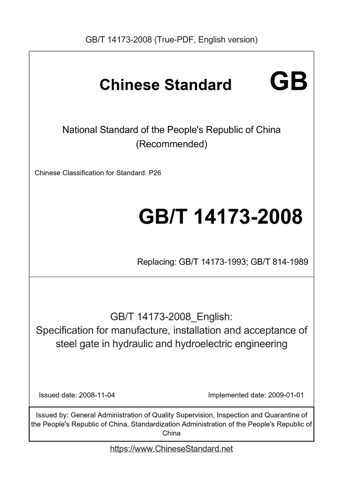 Delivery: <= 7 days. True-PDF full-copy in English will be manually translated and delivered via email. GB/T 14173-2008: Specification for manufacture, installation and acceptance of steel gate in hydraulic and hydroelectric engineering Status: Valid GB/T 14173: Historical versions