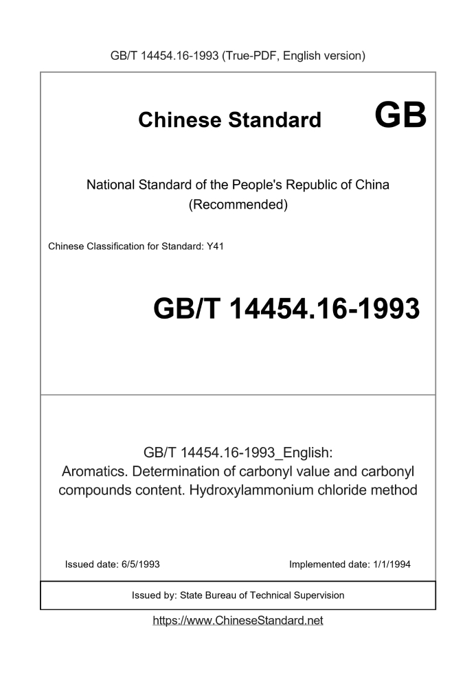 Delivery: <= 2 days. True-PDF full-copy in English will be manually translated and delivered via email. GB/T 14454.16-1993: Aromatics. Determination of carbonyl value and carbonyl compounds content. Hydroxylammonium chloride method Status: Obsolete