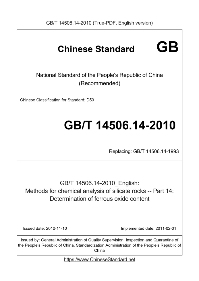 Delivery: <= 3 days. True-PDF full-copy in English will be manually translated and delivered via email. GB/T 14506.14-2010: Methods for chemical analysis of silicate rocks -- Part 14: Determination of ferrous oxide content Status: Valid GB/T 14506.14: Historical versions