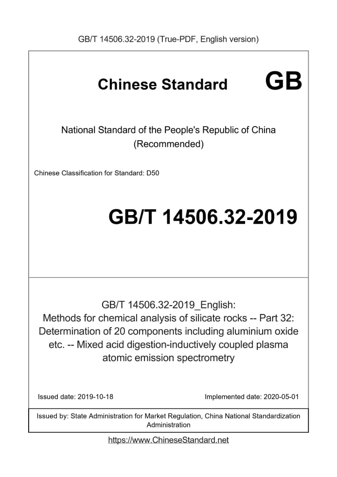 Delivery: <= 5 days. True-PDF full-copy in English will be manually translated and delivered via email. GB/T 14506.32-2019: Methods for chemical analysis of silicate rocks -- Part 32: Determination of 20 components including aluminium oxide etc. -- Mixed acid digestion-inductively coupled plasma atomic emission spectrometry Status: Valid