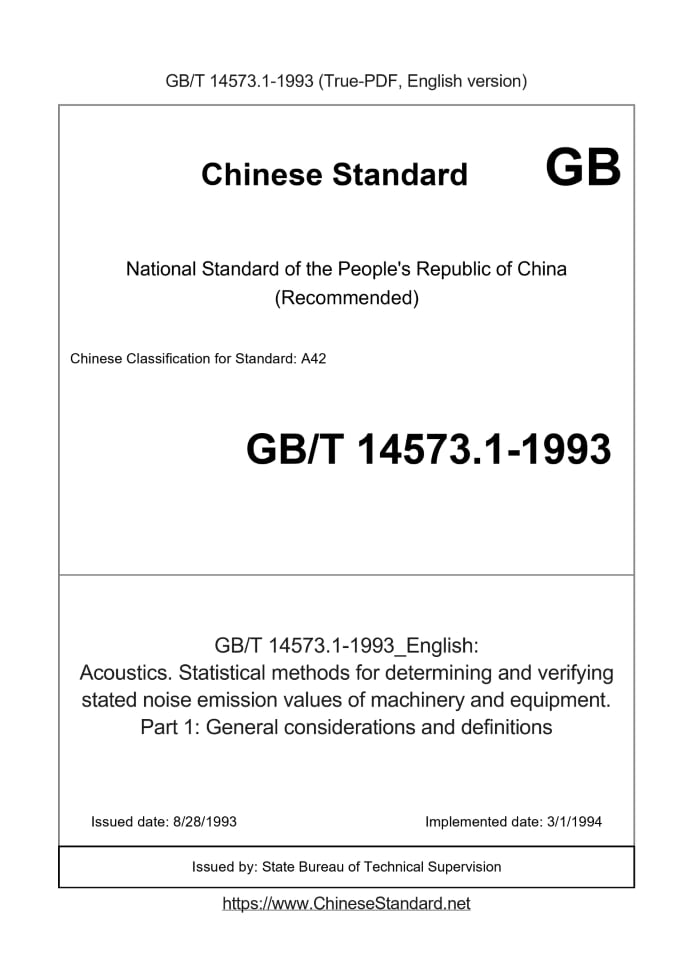 | GB/T 14573.1-1993 English PDFUS$179.00 ยท In stock Delivery: <= 2 days. True-PDF full-copy in English will be manually translated and delivered via email. GB/T 14573.1-1993: Acoustics. Statistical methods for determining and verifying stated noise emission values of machinery and equipment. Part 1: General considerations and definitions