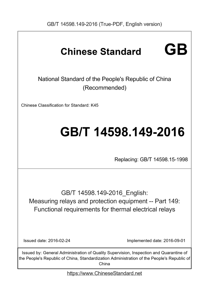 | GB/T 14598.149-2016 English PDFUS$694.00 ยท In stock Delivery: <= 4 days. True-PDF full-copy in English will be manually translated and delivered via email. GB/T 14598.149-2016: Measuring relays and protection equipment -- Part 149: Functional requirements for thermal electrical relays Status: Valid