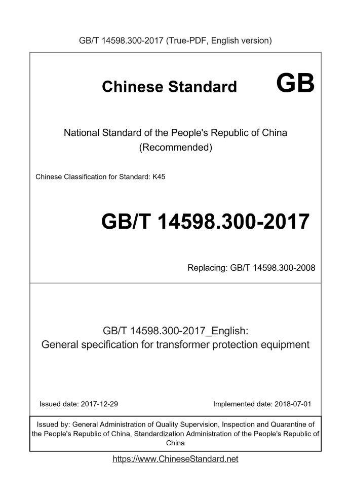 Delivery: <= 4 days. True-PDF full-copy in English will be manually translated and delivered via email. GB/T 14598.300-2017: General specification for transformer protection equipment Status: Valid GB/T 14598.300: Historical versions