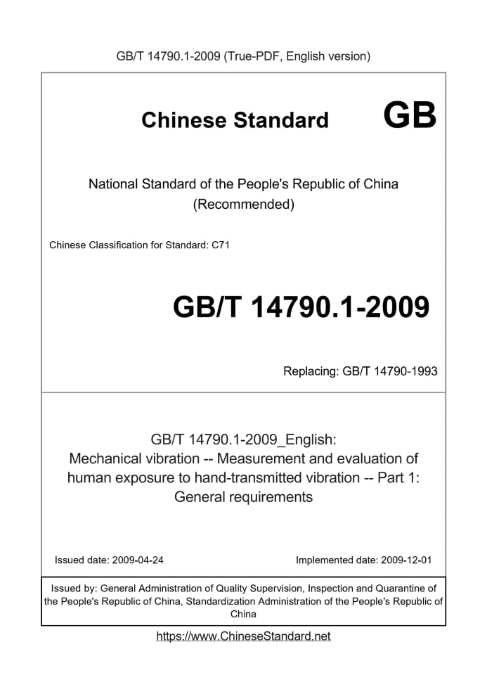 Delivery: <= 4 days. True-PDF full-copy in English will be manually translated and delivered via email. GB/T 14790.1-2009: Mechanical vibration -- Measurement and evaluation of human exposure to hand-transmitted vibration -- Part 1: General requirements Status: Valid GB/T 14790.1: Historical versions