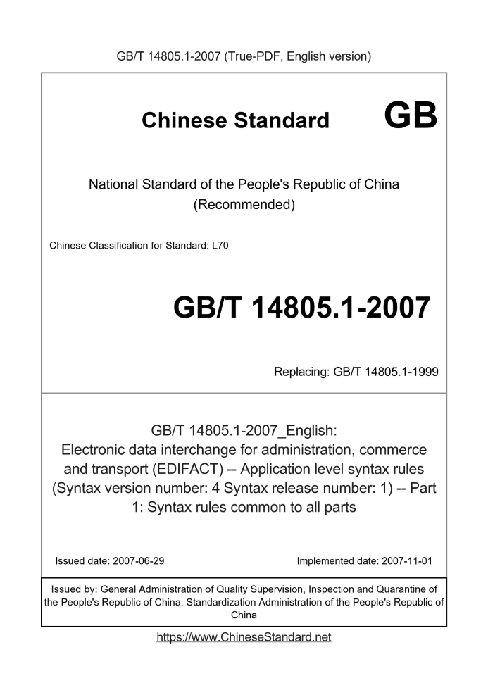 Delivery: <= 4 days. True-PDF full-copy in English will be manually translated and delivered via email. GB/T 14805.1-2007: Electronic data interchange for administration, commerce and transport (EDIFACT) -- Application level syntax rules (Syntax version number: 4 Syntax release number: 1) -- Part 1: Syntax rules common to all parts Status: Valid GB/T 14805.1: Historical versions