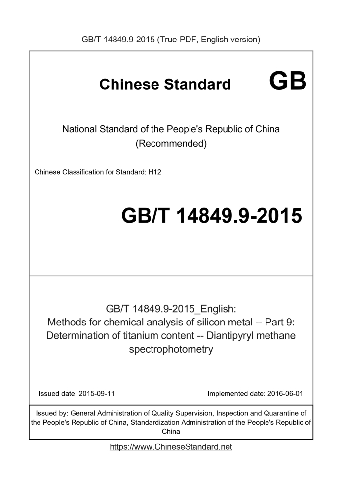 Delivery: <= 3 days. True-PDF full-copy in English will be manually translated and delivered via email. GB/T 14849.9-2015: Methods for chemical analysis of silicon metal -- Part 9: Determination of titanium content -- Diantipyryl methane spectrophotometry Status: Valid