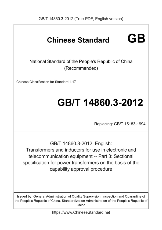 Transformers and inductors for use in electronic and telecommunication equipment Part 3. Sectional specification for power transformers on the basis of the capability approval procedure ICS 29.100.10 L17 National Standards of People's Republic of China Replacing GB/T 15183-1994 Electronic and telecommunication equipment transformers and inductors Part 3. Evaluation of the capability approval procedure Quality specification for power transformers equipment-Part 3. Sectionalspecificationforpowertransformersonthebasis (IEC 61248-3.1996, MOD) Issued on. 2013-06-01 2012-12-31 implementation Administration of Quality Supervision, Inspection and Quarantine of People's Republic of China Standardization Administration of China released