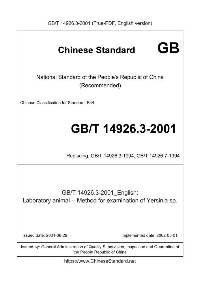 Delivery: <= 3 days. True-PDF full-copy in English will be manually translated and delivered via email. GB/T 14926.3-2001: Laboratory animal -- Method for examination of Yersinia sp. Status: Valid GB/T 14926.3: Historical versions