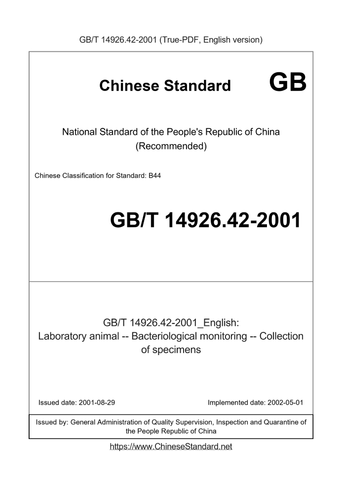 Delivery: <= 3 days. True-PDF full-copy in English will be manually translated and delivered via email. GB/T 14926.42-2001: Laboratory animal -- Bacteriological monitoring -- Collection of specimens Status: Valid