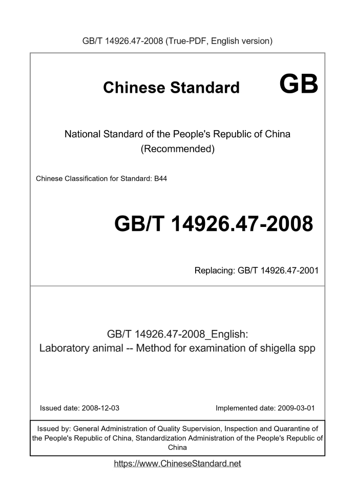 Delivery: <= 3 days. True-PDF full-copy in English will be manually translated and delivered via email. GB/T 14926.47-2008: Laboratory animal -- Method for examination of shigella spp Status: Valid GB/T 14926.47: Historical versions
