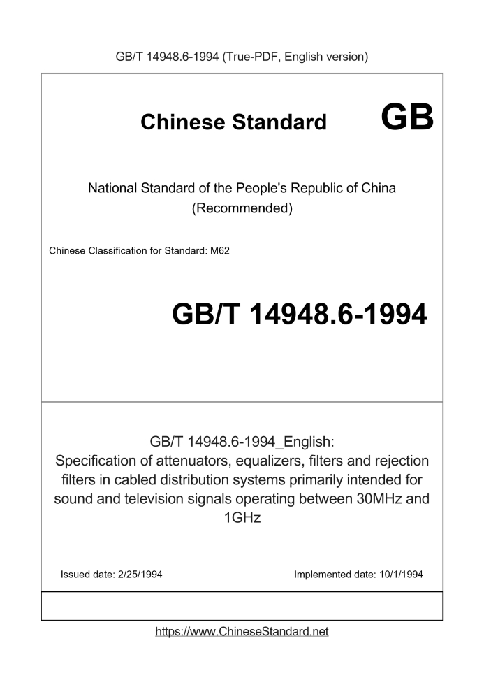 Delivery: <= 3 days. True-PDF full-copy in English will be manually translated and delivered via email. GB/T 14948.6-1994: Specification of attenuators, equalizers, filters and rejection filters in cabled distribution systems primarily intended for sound and television signals operating between 30MHz and 1GHz Status: Obsolete