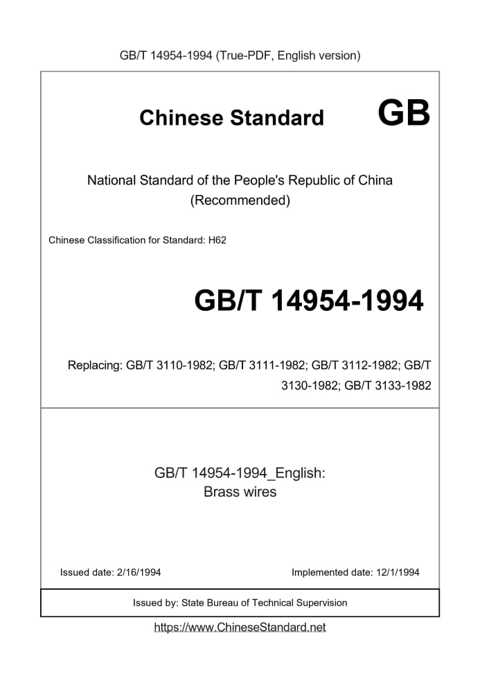 Delivery: <= 3 days. True-PDF full-copy in English will be manually translated and delivered via email. GB/T 14954-1994: Brass wires Status: Obsolete