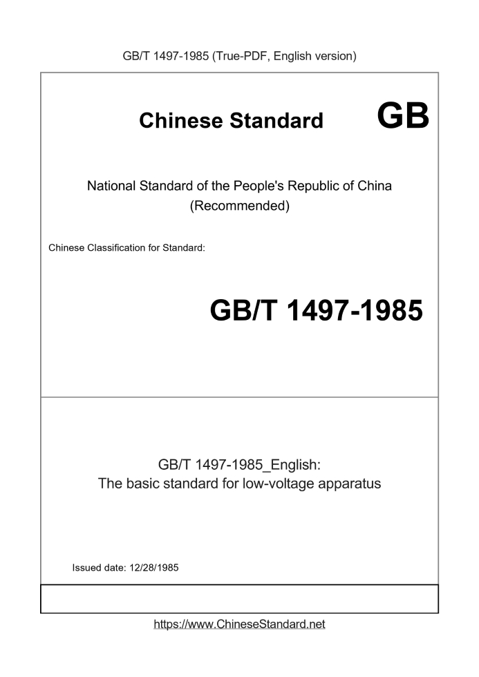 Basic dataStandard ID: GB/T 1497-1985 (GB/T1497-1985)Description (Translated English): The basic standard for low-voltage apparatus Sector / Industry: National Standard (Recommended) Date of Issue: 12/28/1985 Tips & Frequently Asked Questions:Question 1: How long will the true-PDF of GB/T 1497-1985_English be delivered?Answer: Upon your order, we will start to translate GB/T 1497-1985_English as soon as possible, and keep you informed of the progress. The lead time is typically 1 ~ 3 working days. The lengthier the document the longer the lead time.Question 2: Can I share the purchased PDF of GB/T 1497-1985_English with my colleagues?Answer: Yes. The purchased PDF of GB/T 1497-1985_English will be deemed to be sold to your employer/organization who actually pays for it, including your colleagues and your employer's intranet.Question 3: Does the price include tax/VAT?Answer: Yes. Our tax invoice, downloaded/delivered in 9 seconds, includes all tax/VAT and complies with 100+ countries' tax regulations (tax exempted in 100+ countries) -- See Avoidance of Double Taxation Agreements (DTAs): List of DTAs signed between Singapore and 100+ countriesQuestion 4: Do you accept my currency other than USD?Answer: Yes. If you need your currency to be printed on the invoice, please write an email to Sales@ChineseStandard.net. In 2 working-hours, we will create a special link for you to pay in any currencies. Otherwise, follow the normal steps: Add to Cart -- Checkout -- Select your currency to pay. |