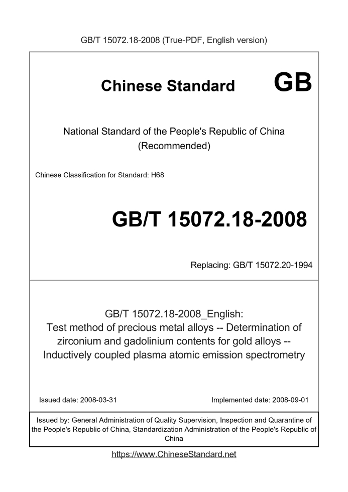 Test method of precious metal alloys. Determination of zirconium and gadolinium contents for gold alloys. Inductively coupled plasma atomic emission spectrometry ICS 77.120.99 H68 National Standards of People's Republic of China Replacing GB/T 15072.20-1994 Methods for chemical analysis of precious metal alloys Gold alloys - Determination of zirconium and gallium content Inductively coupled plasma atomic emission spectrometry Posted.2008-03-31 2008-09-01 implementation General Administration of Quality Supervision, Inspection and Quarantine of People's Republic of China China National Standardization Administration released