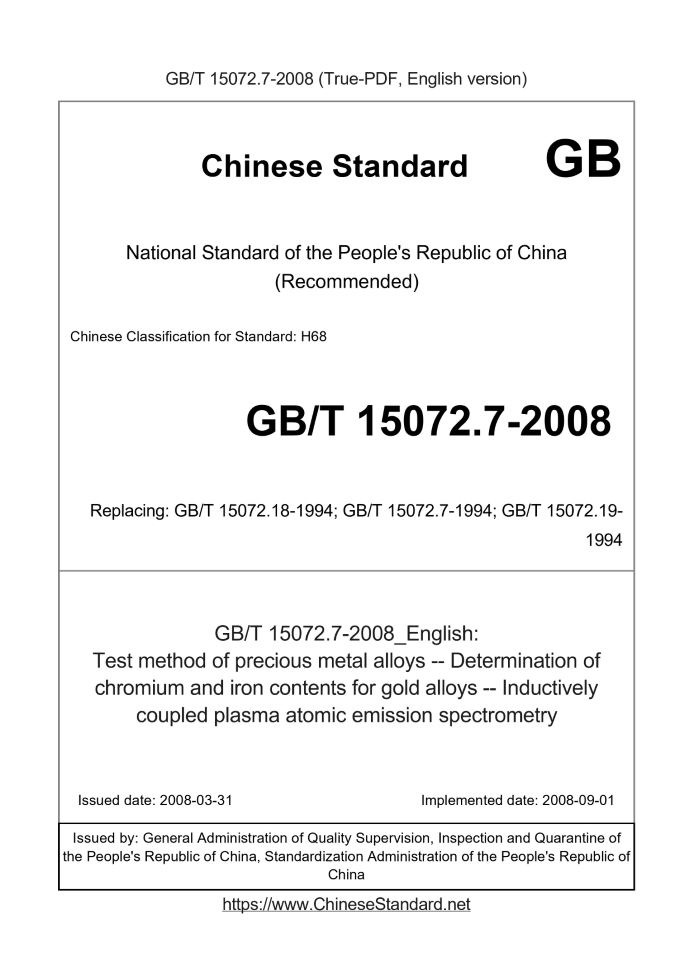 Test method of precious metal alloys. Determination of chromium and iron contents for gold alloys. Inductively coupled plasma atomic emission spectrometry ICS 77.120.99 H68 National Standards of People's Republic of China Replacing GB/T 15072.7-1994, GB/T 15072.18-1994, GB/T 15072.19-1994 Precious metal alloys - Determination of gold alloy of chromium and iron content Inductively coupled plasma atomic emission spectrometry Posted 2008-03-31 2008-09-01 implementation Administration of Quality Supervision, Inspection and Quarantine of People's Republic of China Standardization Administration of China released