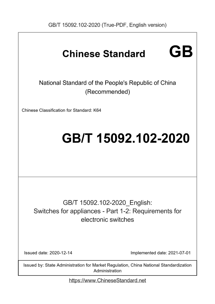 | GB/T 15092.102-2020 English PDFUS$359.00 · In stock Delivery: <= 4 days. True-PDF full-copy in English will be manually translated and delivered via email. GB/T 15092.102-2020: Switches for appliances - Part 1-2: Requirements for electronic switches Status: Valid