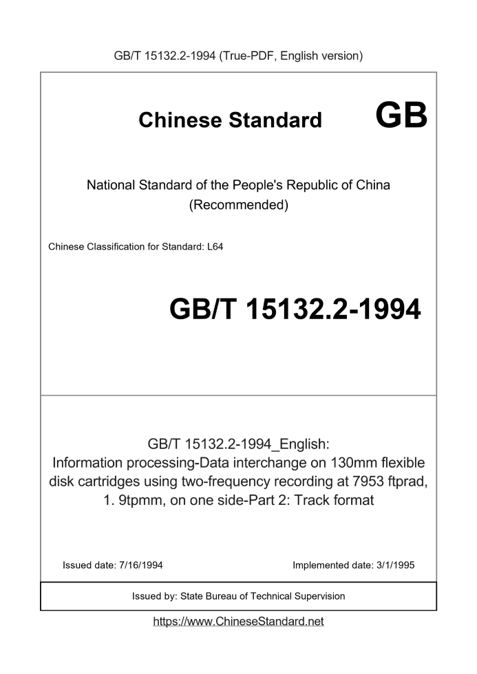 Delivery: <= 3 days. True-PDF full-copy in English will be manually translated and delivered via email. GB/T 15132.2-1994: Information processing-Data interchange on 130mm flexible disk cartridges using two-frequency recording at 7953 ftprad, 1. 9tpmm, on one side-Part 2: Track format Status: Obsolete