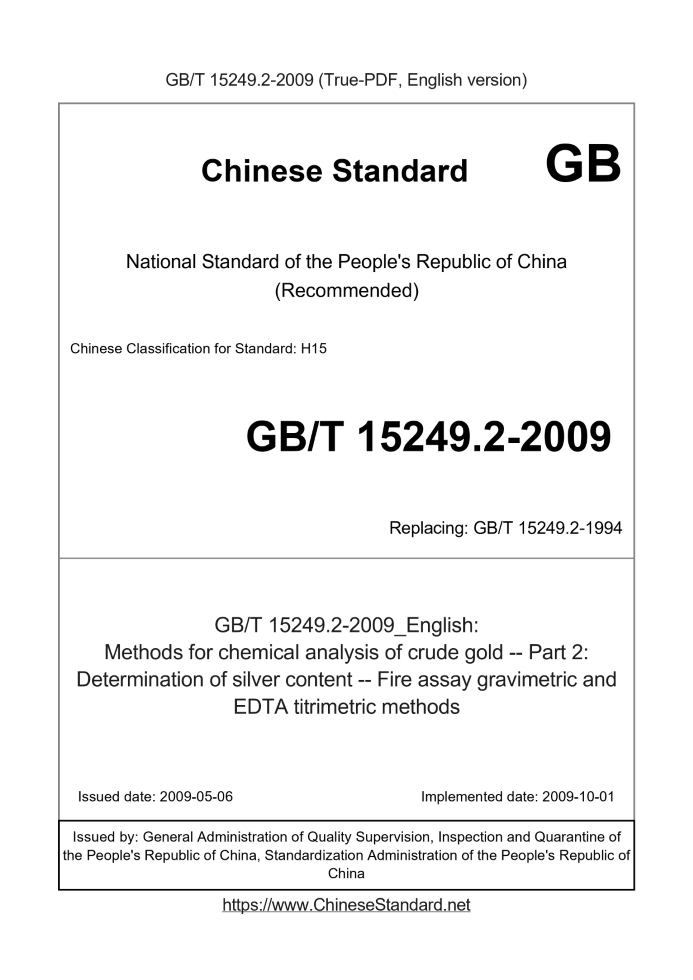 Delivery: <= 3 days. True-PDF full-copy in English will be manually translated and delivered via email. GB/T 15249.2-2009: Methods for chemical analysis of crude gold -- Part 2: Determination of silver content -- Fire assay gravimetric and EDTA titrimetric methods Status: Valid GB/T 15249.2: Historical versions