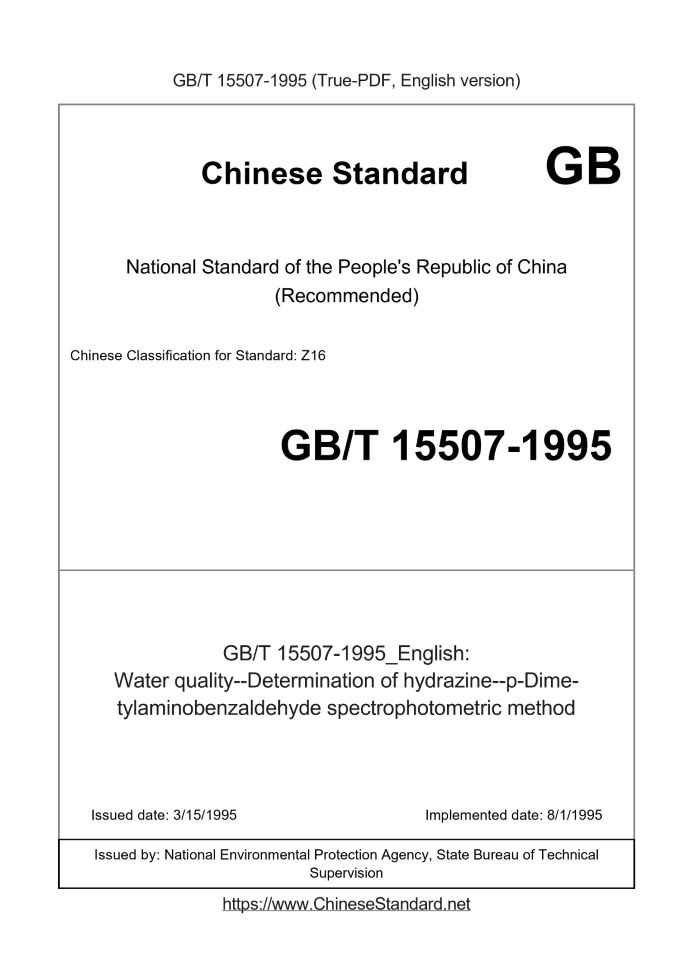 GB/T 15507-1995: Water quality--Determination of hydrazine--p-Dime-tylaminobenzaldehyde spectrophotometric method