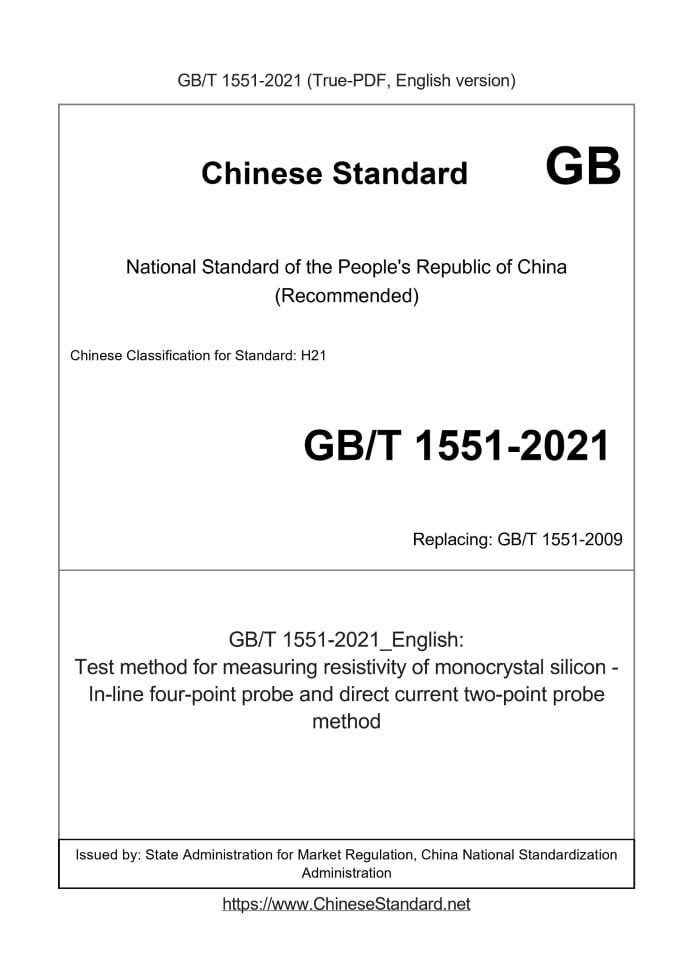 Delivery: <= 5 days. True-PDF full-copy in English will be manually translated and delivered via email. GB/T 1551-2021: Test method for measuring resistivity of monocrystal silicon - In-line four-point probe and direct current two-point probe method Status: Valid GB/T 1551: Historical versions