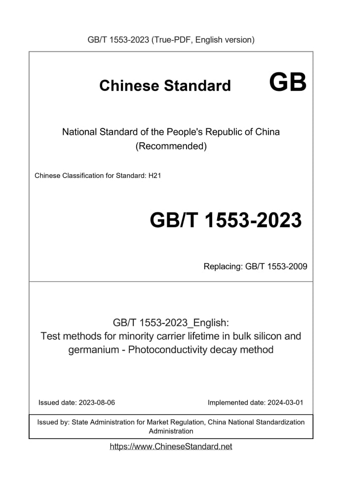 Delivery: <= 5 days. True-PDF full-copy in English will be manually translated and delivered via email. GB/T 1553-2023: Test methods for minority carrier lifetime in bulk silicon and germanium - Photoconductivity decay method Status: Valid GB/T 1553: Historical versions