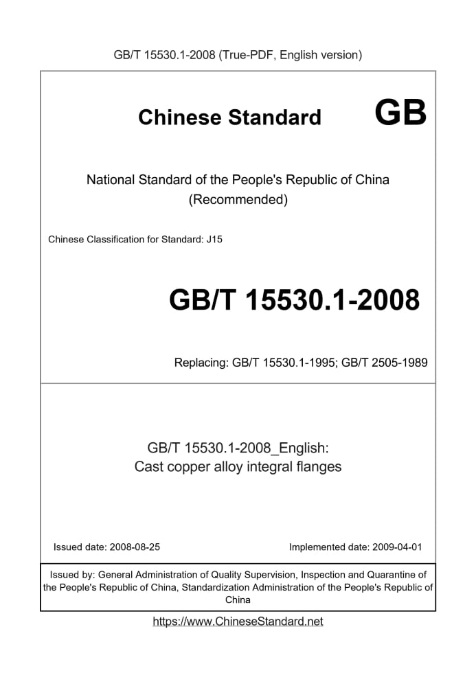 Delivery: <= 3 days. True-PDF full-copy in English will be manually translated and delivered via email. GB/T 15530.1-2008: Cast copper alloy integral flanges Status: Valid GB/T 15530.1: Historical versions