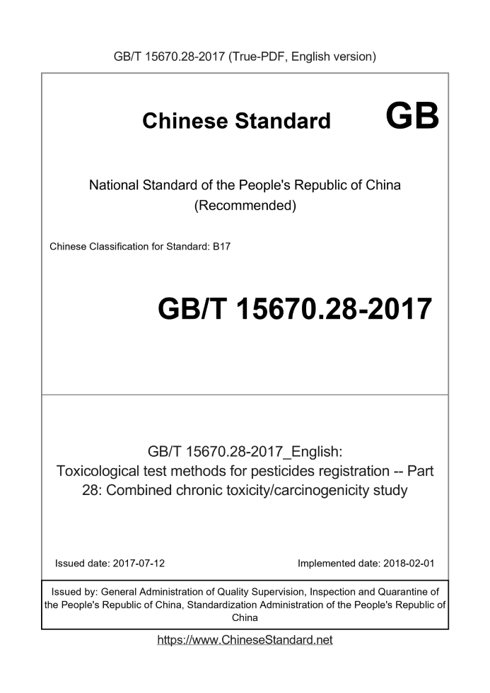Toxicological test methods for pesticides registration - Part 28. Combined croat/carcinogenicity study ICS 65.100 B17 National Standards of People's Republic of China Part of the replacement GB/T 15670-1995 Pesticide registration toxicology test method Part 28. Chronic toxicity and carcinogenesis trials Part 28. Combinedchronicticity/carcinogenicitystudy 2017-07-12 released 2018-02-01 Implementation General Administration of Quality Supervision, Inspection and Quarantine of the People 's Republic of China China National Standardization Management Committee released