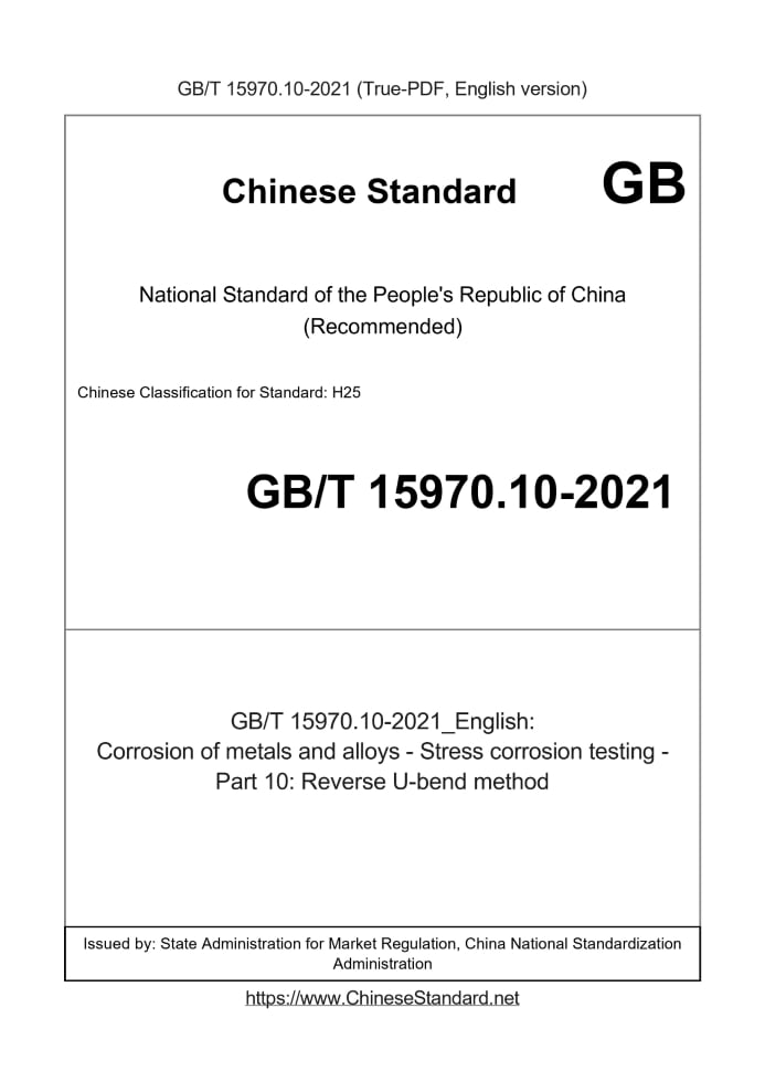 Delivery: <= 3 days. True-PDF full-copy in English will be manually translated and delivered via email. GB/T 15970.10-2021: Corrosion of metals and alloys - Stress corrosion testing - Part 10: Reverse U-bend method Status: Valid