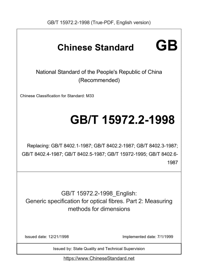 Delivery: <= 6 days. True-PDF full-copy in English will be manually translated and delivered via email. GB/T 15972.2-1998: Generic specification for optical fibres. Part 2: Measuring methods for dimensions Status: Obsolete