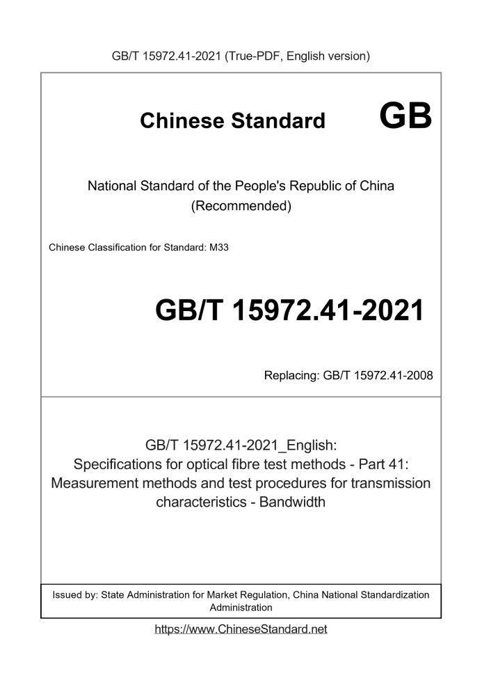 Delivery: <= 5 days. True-PDF full-copy in English will be manually translated and delivered via email. GB/T 15972.41-2021: Specifications for optical fibre test methods - Part 41: Measurement methods and test procedures for transmission characteristics - Bandwidth Status: Valid GB/T 15972.41: Historical versions