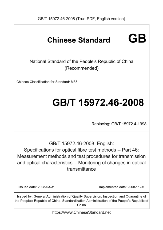 GB/T 15972.46-2008: Specifications for optical fibre test methods -- Part 46: Measurement methods and test procedures for transmission and optical characteristics -- Monitoring of changes in optical transmittance