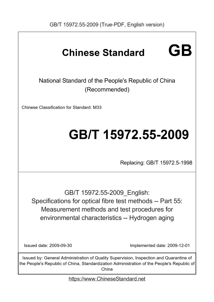 Basic dataStandard ID: GB/T 15972.55-2009 (GB/T15972.55-2009)Description (Translated English): Specifications for optical fibre test methods -- Part 55: Measurement methods and test procedures for environmental characteristics -- Hydrogen aging Sector / Industry: National Standard (Recommended) Classification of Chinese Standard: M33 Classification of International Standard: 33.180.10 Word Count Estimation: 8,888 Date of Issue: 2009-09-30 Date of Implementation: 2009-12-01 Older Standard (superseded by this standard): GB/T 15972.5-1998 Quoted Standard: GB/T 9771.3-2008; GB/T 15972.10-2008; GB/T 15972.40-2008 Regulation (derived from): Announcement of Newly Approved National Standards No. 10 of 2009 (No. 150 overall) Issuing agency(ies): General Administration of Quality Supervision, Inspection and Quarantine of the People's Republic of China, Standardization Administration of the People's Republic of China Summary: This standard provides a hydrogen-containing fibers in a given environment, the hydrogen aging test methods and test procedures. GB/T 15972.55-2009: Specifications for optical fibre test methods -- Part 55: Measurement methods and test procedures for environmental characteristics -- Hydrogen aging---This is a DRAFT version for illustration, not a final translation. Full copy of true-PDF in English version (including equations, symbols, images, flow-chart, tables, and figures etc.) will be manually/carefully translated upon your order. Specifications for optical fibre test methods Part 55. Measurement methods and test procedures for environmental characteristics Hydrogen aging. ICS 33.180.10 M33 National Standards of People's Republic of China Optical fiber test methods - Part 55. Methods of measurement of environmental performance and Hydrogen aging test procedure Posted 2009-09-30 2009-12-01 implementation Administration of Quality Supervision, Inspection and Quarantine of People's Republic of China Standardization Administration of China released ForewordGB/T 15972 "fiber test methods" consists of several components. --- Part 10 ~ 19. Measurement methods and test procedures - General (corresponding to IEC 60793-1-10 ~ IEC 60793-1-19; Generation For GB/T 15972.1-1998); --- Part 20 - Part 29. dimensional parameters measuring methods and test procedures (corresponding to IEC 60793-1-20 ~ IEC 60793- 1-29; instead of GB/T 15972.2-1998); --- Part 30 - Part 39. Mechanical properties measurement methods and test procedures (corresponding to IEC 60793-1-30 ~ IEC 60793- 1-39; instead of GB/T 15972.3-1998); --- Part 40 - Part 49. transmission characteristics and measurement methods and test procedures for optical characteristics (corresponding to IEC 60793-1-40 ~ IEC 60793-1-49; instead of GB/T 15972.4-1998); --- Part 50 - Part 59. Environmental Performance Measurement methods and test procedures (corresponding to IEC 60793-1-50 ~ IEC 60793- 1-59; instead of GB/T 15972.5-1998). Wherein the GB/T 15972.5 × consists of the following components. --- Part 50. Measurement methods and test procedures for environmental characteristics constant heat; --- Part 51. Measurement methods and test procedures for environmental performance of dry heat; --- Part 52. Measurement methods and test procedures for the environmental performance of temperature cycles; --- Part 53. Measurement methods and test procedures for environmental characteristics of flooding; --- Part 54. Environmental Performance Measurement methods and test procedures gamma irradiation; --- Part 55. Measurement methods and test procedures for environmental characteristics of hydrogen aging. This section GB/T 15972 Part 55. The reference test methods in some of the major reference IEC 60793-2-50.2008 "Fiber Part 2-50. Product specification class B single-mode fiber specification" (in English), combined with the specific circumstances of the domestic test system Given. Appendix A of this section is an informative annex. This part is proposed by the Ministry of Industry and Information Technology of the People's Republic of China. This part of the jurisdiction of the China Communications Standards Association. This section is drafted. Wuhan Research Institute of Posts and Telecommunications, Optical Fiber and Cable Co., Ltd. The main drafters of this section. Chen poetry, Li Haiqing, Li Jing, Liu Cheng, Cheng Shuling. Optical fiber test methods - Part 55. Methods of measurement of environmental performance and Hydrogen aging test procedure1 ScopeThis section GB/T 15972 specifies the optical fiber in a given environment in the hydrogen-containing hydrogen aging test methods and test procedures. This part is suitable for assessing GB/T 15972.10-2008 specified in B1.3 class extended wavelength band dispersion unshifted single-mode optical Hydrogen aging performance fiber can also be used to evaluate the B4 class hydrogen aging performance single-mode fiber.2 Normative referencesThe following documents contain provisions which, through reference GB/T 15972 in this section constitute provisions of this section. For dated reference documents Member, all subsequent amendments (not including errata content) or revisions do not apply to this section, however, encouraged to reach under this section Parties to research agreement to use the latest versions of these documents. For undated reference documents, the latest versions apply to this section. Non-dispersion shifted single-mode optical fiber characteristic wavelength band extension. GB/T 9771.3-2008 communication with single-mode fiber - Part 3 GB/T 15972.10-2008 fiber test methods - Part 10. Measurement methods and test procedures - General (IEC 60793-1-1.2002, Opticalfibres-Part 1-1. Measurementmethodsandtestprocedures-General andguidline, MOD) GB/T 15972.40-2008 fiber test methods - Part 40. Measuring methods for transmission and optical characteristics and testing Program attenuation (IEC 60793-1-40.2001, Opticalfibres-Part 1-40. Measurementmethodsandtestproce- dures-Attenuation, MOD)3 t