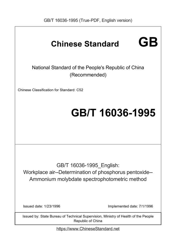 Delivery: <= 2 days. True-PDF full-copy in English will be manually translated and delivered via email. GB/T 16036-1995: Workplace air--Determination of phosphorus pentoxide--Ammonium molybdate spectrophotometric method Status: Obsolete