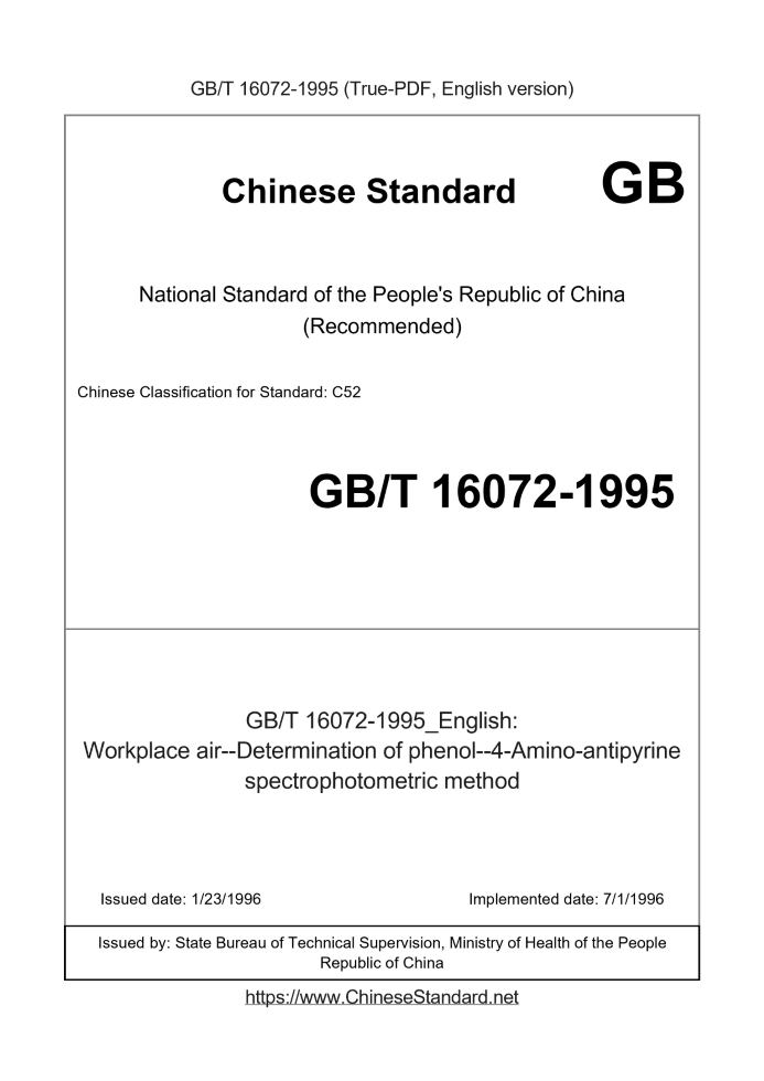 Delivery: <= 2 days. True-PDF full-copy in English will be manually translated and delivered via email. GB/T 16072-1995: Workplace air--Determination of phenol--4-Amino-antipyrine spectrophotometric method Status: Obsolete